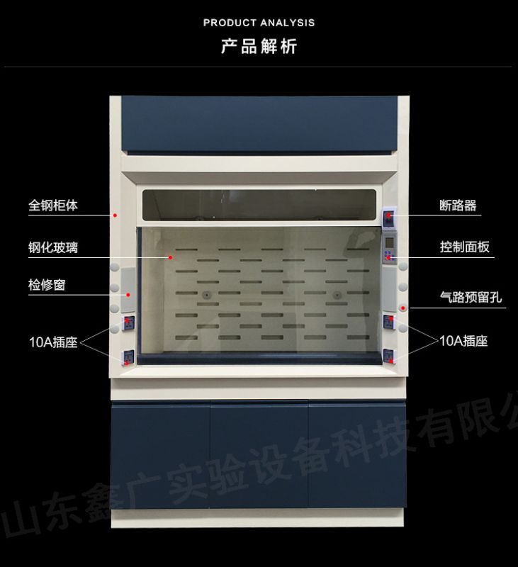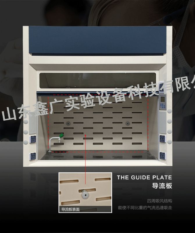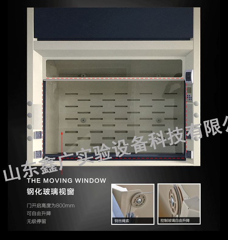 4、通風(fēng)柜正前方全部為玻璃視窗,有良好的可視范圍。擾流板和內(nèi)襯材料一致,擾流板支架由非金屬材料構(gòu)成。